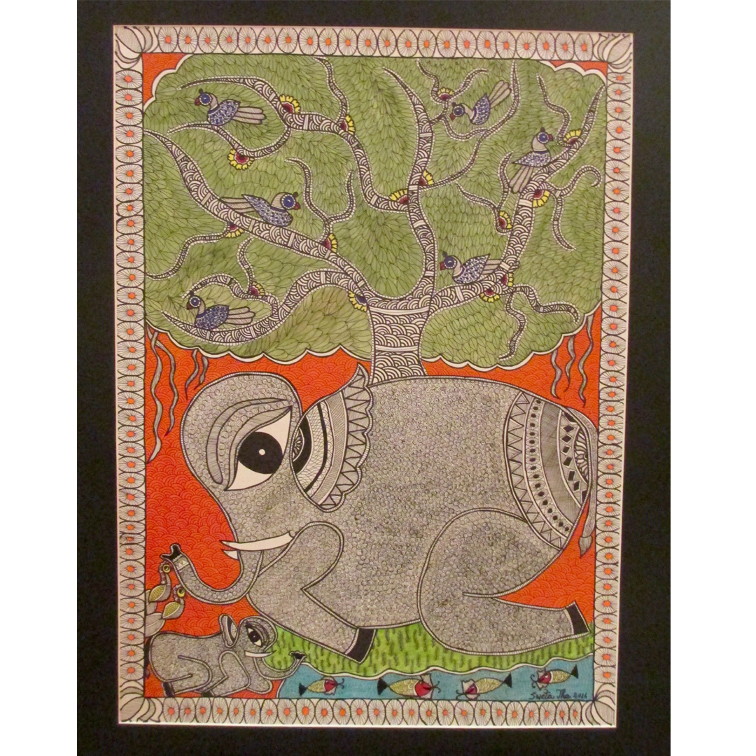 Depicted on this painting is the mother and child elephant. Both of them are pictured here as heavily adorned in the typical traditional Mithila patterns.
